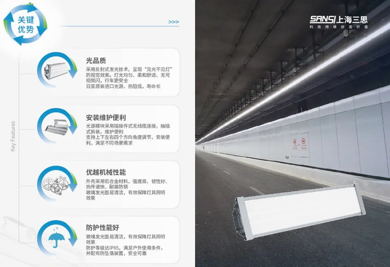 通过大规模应用三思反射式发光技术隧道灯——这一非间接照明灯具,解决了传统隧道照明高透光率与眩光感知间的矛盾,营造出高品质、高水平、舒适、节能的城市隧道照明环境。