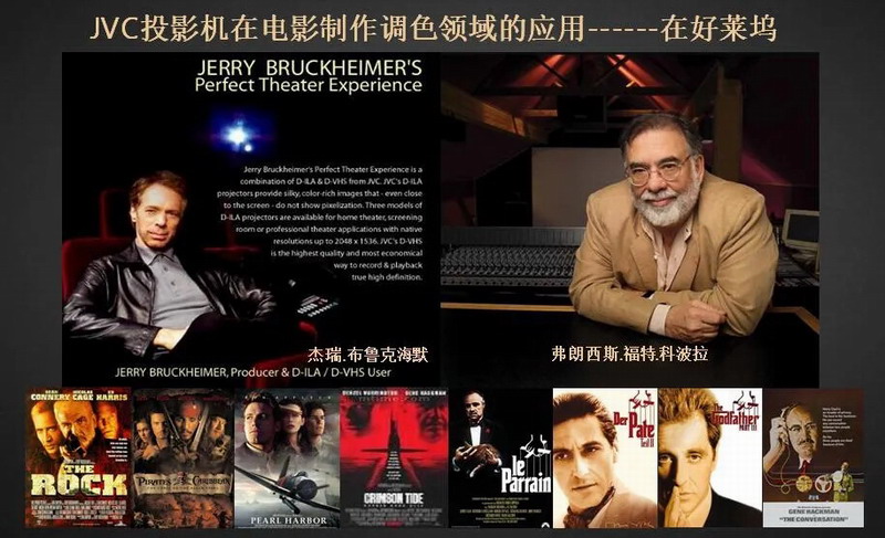 在好莱坞,使用JVC投影机进行画质校准的电影有:《碟中谍》系列、《加勒比海盗》系列、《教父》系列、《珍珠港》等众多好莱坞经典大片。