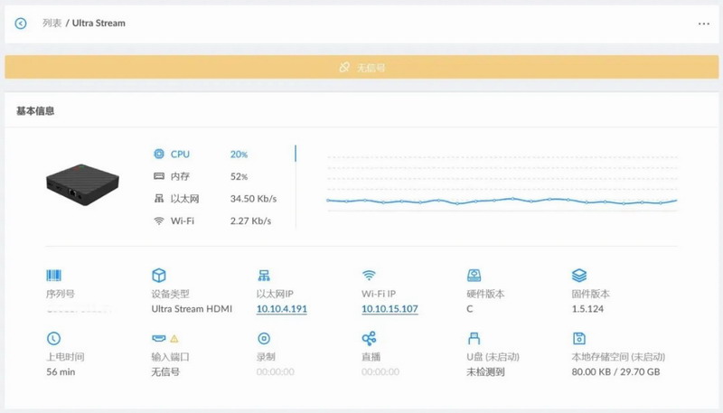 在Magewell Cloud“所有设备”页签中,点击设备名称,可查看对应设备运行状态、IP地址、固件版本等基本信息。