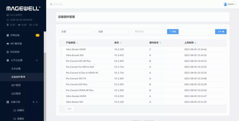 Magwell Cloud支持统一管理设备固件,用户可以进行固件的批量上传、升级(限相同型号、相同硬件版本)删除等操作。