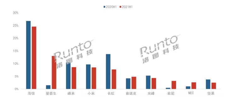 2021年上半年,前十名品牌的总出货量从76.9%上升至79.8%,集中度进一步提升,同时,品牌格局发生大变。