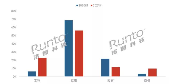 高增长的原因,首先是2020年COVID-19疫情造成同比基数较低;其次,在家用、工程、商用场景,激光产品趋势上升。家用产品的幕布等部件技术实现突破、价格倾向平民化,因此市场保持了高位规模和高速增长;党建推动了党史展馆、红色景区、教育基地、服务中心等工程项目;餐饮光影需求走高,以及会议办公市场大盘的增长使得商务场景亦实现倍增。