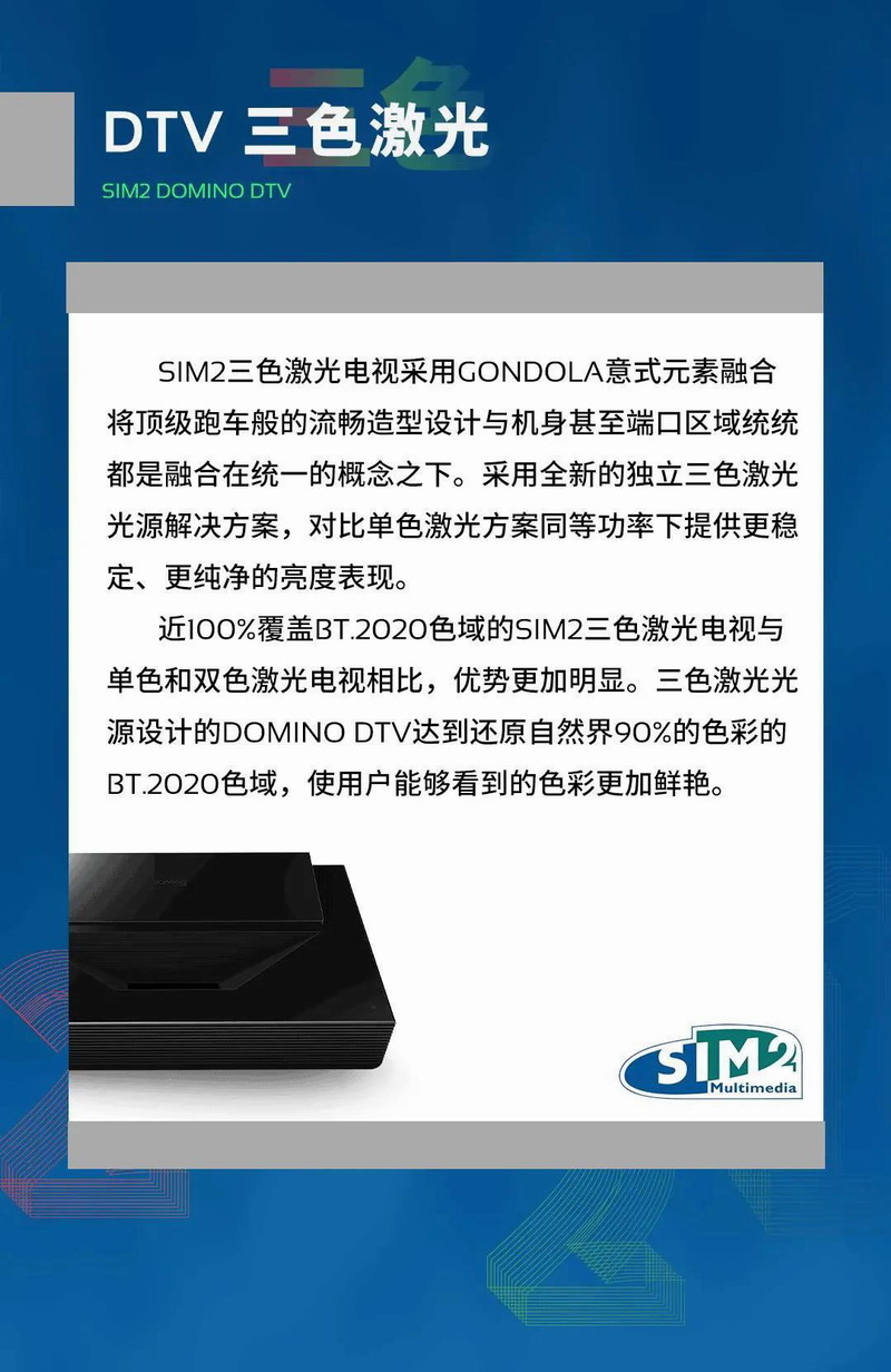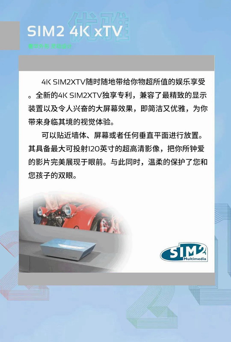意大利SIM2投影机借此契机携最新最热的家用投影亮相本届展会,效果演示:DTV-三色激光超短焦投影机;静态展示-SIM2水晶玻璃外形款全系列投影机:xTV 4k(超短焦激光投影),Crystal4 sh(复合激光光源正投投影机),Nero4s旗舰款以及Domino4入门基础款。一定能找到一款适合你的高端家用投影机,等你来看哦~