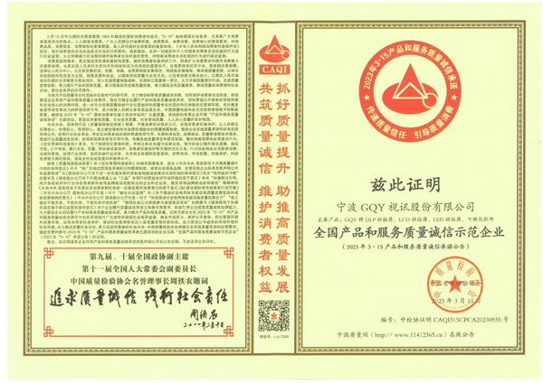 在2023年的评选中,GQY视讯荣获了中国质量检验协会颁发的四项大奖:全国产品和服务质量诚信品牌、全国产品和服务质量诚信示范企业、全国视讯行业质量领先企业、全国质量检验稳定合格产品。GQY视讯已经连续多年响应“3.15”质量诚信承诺活动,高质量发展是产业的未来,质量强企,质量强国。