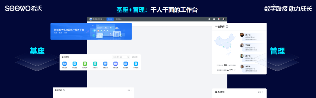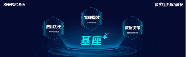 2021年,教育部发布了《关于推进教育新型基础设施建设构建高质量教育支撑体系的指导意见》,强调要构建“互联网+教育”大平台,聚合各类教育应用,构建面向各级各类学校的开放平台。2023年世界数字教育大会上,怀部长提出“应用为王,服务至上“概念,并发布了《智慧教育平台标准规范》,强调需加强平台建设、数据汇聚、资源共享,提升教师素养。希沃积极响应政策号召,发布了融合“基座+应用”,“基座+管理”,“基座+数据”三位于一体的希沃魔方·数字校园基座。