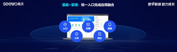 希沃魔方提出的“基座+应用”理念,意在通过基座强大的开放融合能力集成校内应用工具,构建可持续发展的应用中心,实现工具互联,助力学校在统一平台实现校园事务一站式管理,以解决入口分散问题。