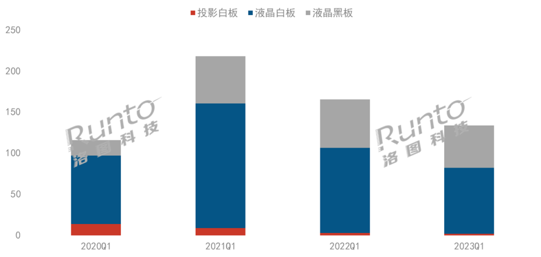 根据洛图科技(RUNTO)数据显示,2023年第一季度,投影白板出货量接近0.2万台,同比下降38.2%,在教育市场中份额已不足2%;液晶白板出货量8.0万台,同比下降22.4%,教育市场市占率约60%;液晶黑板历史上首次在第一季度出现下滑,幅度为-12.5%,出货量5.2万台,在教育市场的市占率增至39%。
