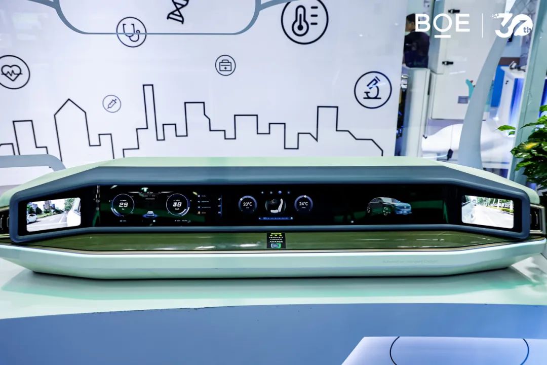 在智慧出行领域,基于领先的显示和AIoT技术融合,京东方全球首发的智慧驾舱搭载了42.2英寸贯穿屏及6.94英寸CMS(电子外后视镜),整个座舱的外观、显示、硬件板卡、软件系统均由京东方自主研发,屏幕拥有10K超高分辨率、百万级超高对比度、110%色域饱满画质的极致视觉体验,仪表盘区域搭载屏下摄像头,可实现即人性化又安全化的智慧功能。同时,智慧车载的安全带检测、疲劳驾驶识别、车主识别等5项AI安全驾驶技术实现落地。
