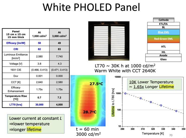 两位教授表示绿色二极管耐用性最高,而蓝色的耐用性最低,如果撇除蓝色二极管的影响,OLED 面板的理论寿命为 100 多年,或大约 100 万小时。