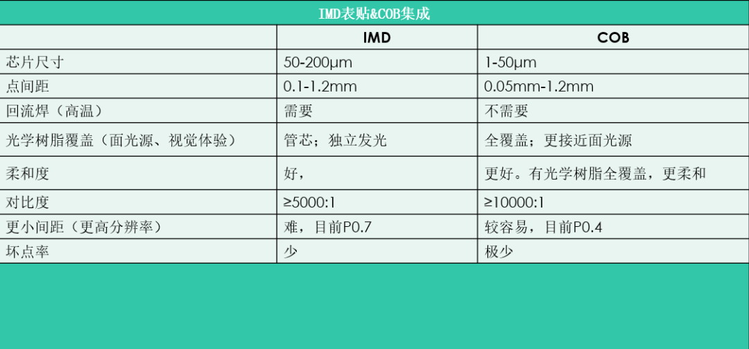 IMD可以看成一个小的COB单元,所面临的的技术难题与COB封装相似,难度有所降低,但IMD方案存在一定的物理极限,无法无限缩小像素间距。