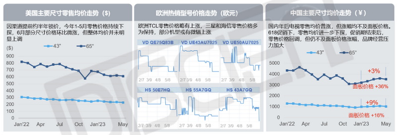 第三:从品牌策略来看,在价格不断上涨的前提下,品牌厂运营逐渐承压。以美国市场为例,因渠道提前约半年锁价,1-5月份终端TV整机的零售价格在逐月下探,整体均价并未明显上调。因此在面板价格上调、终端价格维持的情况下,成本的压力均由品牌厂在承担。而对于中国区,刚刚过去的618促销结果不及预期,根据DISCEIN数据统计,2023年618全线TV销量同比下滑10%左右;且在618之后,品牌纷纷上调终端价格,预计将会抑制一定的需求。从品牌库存水位来看,上半年追加的采购,在需求不振的情况下已转化为库存,部分品牌的库存水位均有不同程度的攀升。因此在品牌经营承压的状况下,品牌端或许会像21年一样,基于经营压力而选择减少未来采购量。