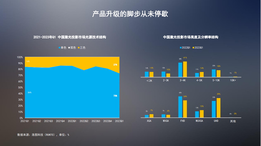 激光显示产品升级的趋势从未停歇。投影技术从单色、双色到三色,2023年第一季度,三色激光技术在市场中的占比已经接近三成。亮度向3-5K流明的中高端迁移,分辨率从2K到4K,8K的激光电视也已经面世。