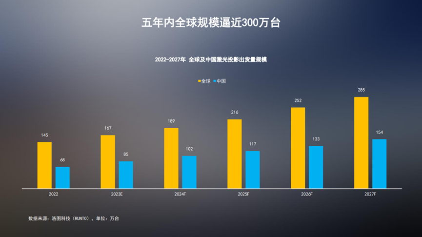 激光显示市场将保持强劲的发展势头。洛图科技(RUNTO)预测,2027年,全球激光投影出货量规模有望达到285万台,2022-2027年间的复合增长率为14.5%;中国市场规模将达到154万台,占全球市场的54%。