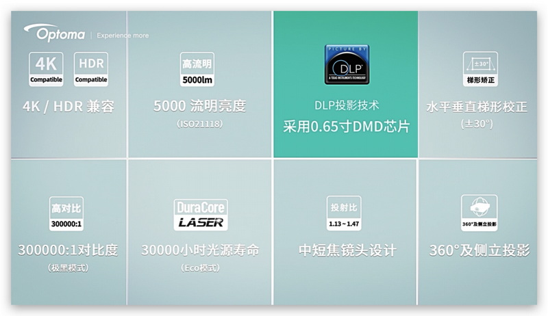 除了投射距离,亮度也是商用投影仪最看重的参数,毕竟这类产品大部分的使用时间是在白天,因此采用激光光源的投影相对于LED和传统的灯泡就有着“先天优势”。但单纯的提高亮度也会影响画面的色彩表现,有些产品会出现画面泛白的现象。对此奥图码EL520H采用Optoma DuraCor激光技术+德仪0.65寸DDP4422 HV DLP DMD芯片方案,在实现5000流明的亮度和300000:1对比度的同时,也能提供惊人的色彩。