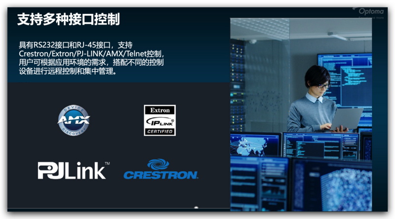 除此之外,投影仪一些特色的功能配置往往也是加分项,可以满足一些特定的应用,尤其是商用投影会配备比较齐全的接口,例如奥图码EL520H除了2个主流的HDMI1.4b接口,还配备了1个RJ45网络接口、1个RS232控制接口和一个音频输出接口,可兼容更多新老设备,并能直联音响设备。