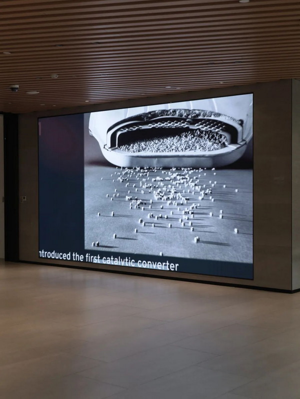 通向办公区域的通道,一块 4K 超高清 3,840 × 2,160 像素矩形横屏用来播放公司介绍。来访的客户在会客区小憩时,抬头便可以了解到公司的百年历史。