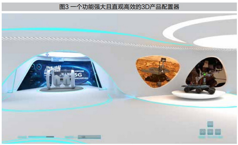 对工业企业来讲,智能制造一般有两个比较大的投入:一个是建设厂房之前的设计,另一个是建完厂房之后的运营。设计和运营阶段都可以引入数字孪生,并自然延伸到销售阶段,打通从“工厂”到“客户”的全流程。在工业领域,汽车行业已实现了汽车的在线选型以及配件的自主选装和下单。各大行业头部企业也在加快产品数字化、智能化的布局。传统的纸质说明书以及宣传手册已经无法满足当下客户快速、精准、高效获取信息的需求。这些无法数字化的物品会延长销售人员和新客户对产品的学习周期,导致销售人员对产品理解不足、客户对产品兴趣下降。相反,在销售环节植入数字化的3D产品配置能够给用户带来更加直观、简洁、新颖的体验。借助数字孪生的3D产品配置器(如图3),非专业人士可以直接创建出基于Web的3D产品配置体验,设计师与艺术家们可以直接创建出基于网页的沉浸式交互式3D体验。更重要的是,对缺少数字部门但面临数字化交付压力的大量中小企业来说,Web3D产品配置无疑可以为其提供实实在在的数字化赋能。