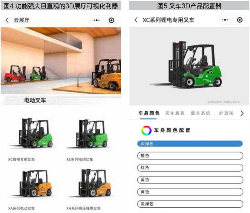 杭叉集团股份有限公司(以下简称“杭叉集团”)是中国最大的叉车研发制造企业之一,其出口业务遇到的一个棘手问题是,如何应对不同市场的众多变种需求?比如一个产品,在东南亚市场需要变化,到美国市场,产品的样式要做一点改变,到了欧洲市场,又要有新东西。这么多变种需求,不仅要杭叉集团应对,还需要上下游合作伙伴的配合,难度指数上升。以前,每张图画出来后需要反反复复与各个环节沟通,效率极低。数字孪生的3D选配方案很快就解决了这个问题,效率大大提升(见图4、图5)。多样性产品变种还处在设计阶段时,市场调研与市场感知就可以同步启动了。多方在可重组、可编辑的数字空间中达成共识、意见一致,企业再开始生产。