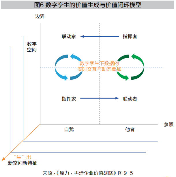 如图6所示,在数字孪生作用下,数据实时交互与动态叠加,参与者在“自我-他者”相对参照与相互映射中,并非保持单一的“指挥家”与“联动者”角色,而是以两种角色持续交互与叠加的方式参与其中。随着价值联动的展开,新特征得以持续涌现,原有的价值体系变得立体起来,不断突破价值新空间。“指挥家”与“联动者”得以新生,联动方式得以延展,不断打通物理空间与数字空间的界限。以“生”的方式维系供需“非均衡”的基本常态,通过价值共享与价值共创持续互动,涌现商业新特征、释放价值新空间,这是一个生生不息的过程。