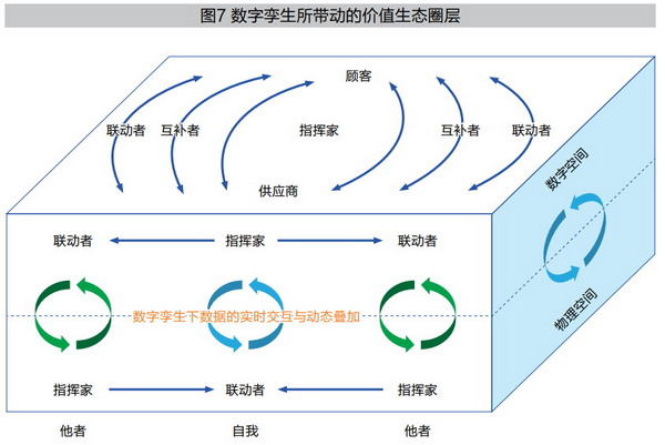数字孪生不仅是一个技术工具,更是一个包容多方参与的舞台。正如图7所示,在图上面的“价值圈层”中有指挥家、互补者、联动者三个角色。这三个角色对应的主体不是固定的,可能是核心企业,也可能是其上下游的供应商与渠道。一个主体的角色也是不断变化的,这是因为自我与他者的角色转化与相互带动,需要结合 “实体空间”和“数字空间”两个参考系来一起共融。