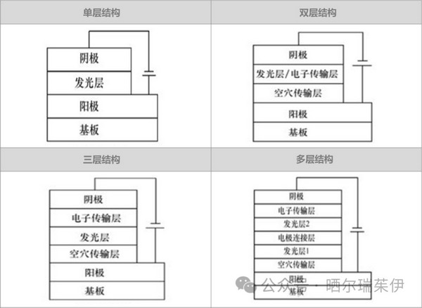 按器件结构分类,OLED可以分为单层结构、双层结构、三层结构和多层结构。其中多层结构OLED具有更高的功能性和稳定性。