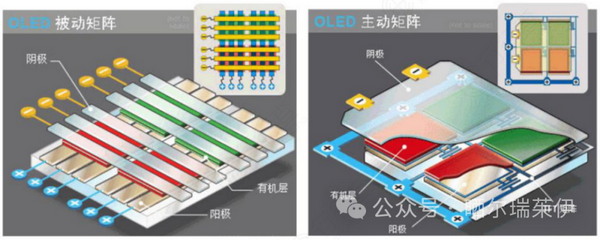 按驱动方式分类,OLED可以分为被动式(PMOLED)和主动式(AMOLED)。被动式驱动也称为无源驱动,通常采用矩阵网格的电极结构,主要应用在显示器尺寸比较小的显示器中。主动式驱动也称为有源驱动,通常采用薄膜晶体管(TFT)作为驱动元件,主要用于高分辨率、大尺寸、快速显示的产品。