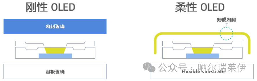 按基板材料分类,OLED可以分为刚性OLED和柔性OLED。刚性OLED即传统的OLED,使用的是玻璃基板,制造成本较低,主要应用于传统的显示设备;而柔性OLED使用的是塑料、金属薄膜,玻璃薄片等柔性基板,制造成本较高,多被应用于一些新型的柔性显示设备。