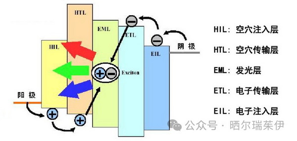 OLED核心原理是利用有机材料在电场的作用下产生发光现象。具体来说,当电流通过特定有机材料薄膜时,电子和空穴分别从阴极和阳极注入到有机发光层,并在有机发光层中相遇,形成激子(电子空穴对),激子辐射退激后发出光子,最终产生可见光。