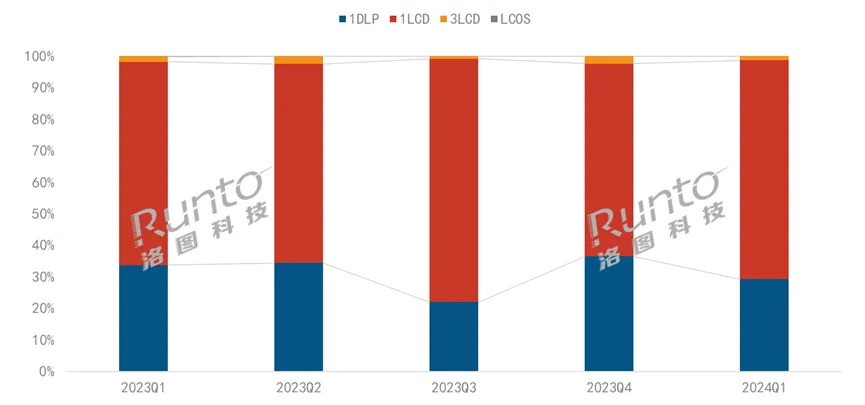 根据洛图科技(RUNTO)线上监测数据显示,2024年第一季度,DLP技术在线上市场的份额降到了三成以内,较去年同期下降了4.5个百分点。