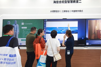 针对高职校大型教学空间,海信商用显示从不同痛点出发,在现场搭建了两种合班型智慧教室解决方案。方案一采用海信激光工程投影机、互联黑板、海信智慧讲台等搭建而成,老师无需复杂的课前准备即可一键上课,教室内的激光投影、智慧讲台、灯光、窗帘等设备自动开启。100英寸激光幕布搭配互联黑板,在满足大视野护眼显示的同时,还可进行大面积书写,粉笔板书同步上屏,让学生清晰观看。方案二采用海信电容一体机三联屏搭建而成,现场,三屏同显、三屏异显、三屏联动的课堂内容展示形式,让许多老师纷纷驻足体验。
