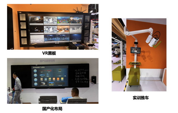 欧帝:展示VR黑板,黑板配置8套VR设备,支持无限充电,为学生提供沉浸式视觉体验,产品搭载VR教学软件,支持智慧实验创新教室、探索课堂等多种教学场景。国产化方面展示支持飞腾、兆芯芯片,兼容统信、麒麟、鸿濛系统的布局。录播教学方面首次展示实训推车产品。