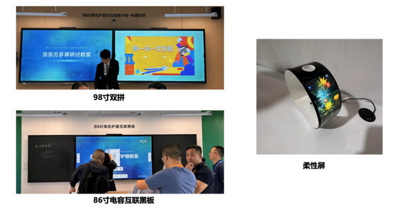 京东方艺云:展示了量子点一体机/类制护眼屏/ 8K显示屏/柔性屏等技术成果之外,在教育解决方案中展示了98寸双拼/86寸电容互联黑板/及国产化信创等解决方案。同时也展示了90/98/110寸等全规格尺寸产品。