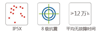 专业的防尘/ 抗震设计,具备IP5X 防护等级,通过8 级抗震检测,平均无故障工作时间(MTBF)不小于12 万小时。