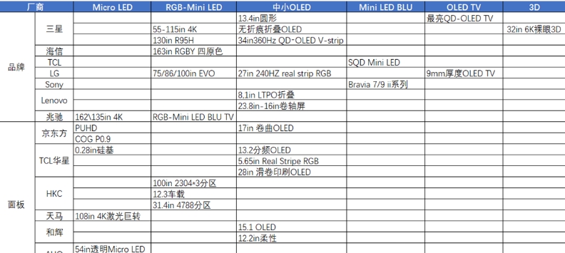 CES2026三大看点确实就是CES2026显示产业的三大主题。下图就把各厂家显示部分的主力展品做了整理,可以看到三大主题非常集中。