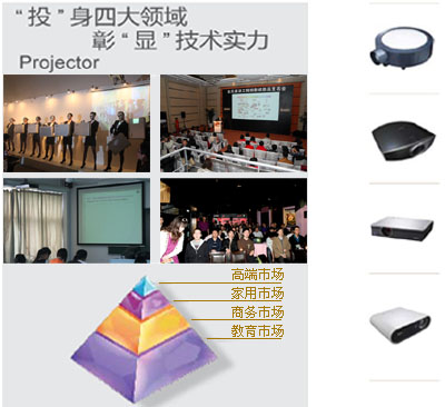 作为中国投影机市场的领军品牌,索尼也是投影机核心元件的主要生产商。从七十年代到现在,投影机经历了CRT管,液晶板,SXRD(反射式液晶技术)等主流技术的应用。而索尼都是当仁不让的担当起主要开发者的角色。在竞争激烈的中国投影机市场,索尼以高度的本地化策略来区别于竞争者。基本上全国产化的产品线能更好的满足不同地区客户的需要,全扁平化的销售渠道可以提供更好的售前售后服务。与民用产品共享维修点更是为使用者提供最大的方便。在教育领域,清华大学、华东政法大学、上海对外贸易学院等院校多媒体教室选择了索尼专为教育行业打造的CX系列投影机为莘莘学子传授知识;在企业及高端领域,国华人寿、通用集团、宝马中国等大中型企业多媒体会议室和培训中心里索尼的高分辨率投影机随处可见;在家用领域,采用SXRD技术的索尼VPL系列投影机正在成为高清1080p家庭影院市场的首选。