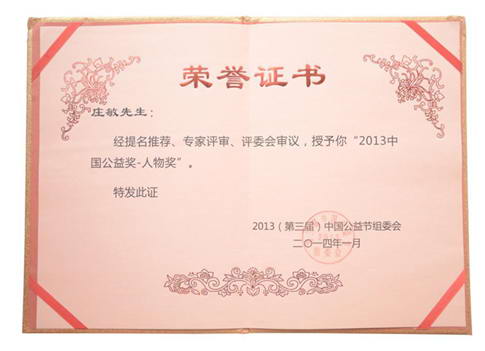 2014年1月16日,备受瞩目的第三届中国公益节在北京圆满落幕。经过提名推荐、专家评审和评委会审议等多重审核环节,深圳市保千里电子有限公司董事长庄敏被授予“2013中国公益奖——人物奖”。
