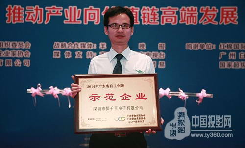 8月19日,以“推动产业向价值链高端发展”为主题的首届广东省企业自主创新活动周开幕式暨企业创新成果发布会在广州举行。深圳市保千里电子有限公司获评“2014年广东省自主创新示范企业”殊荣,保千里副总裁陈杨辉出席领奖。