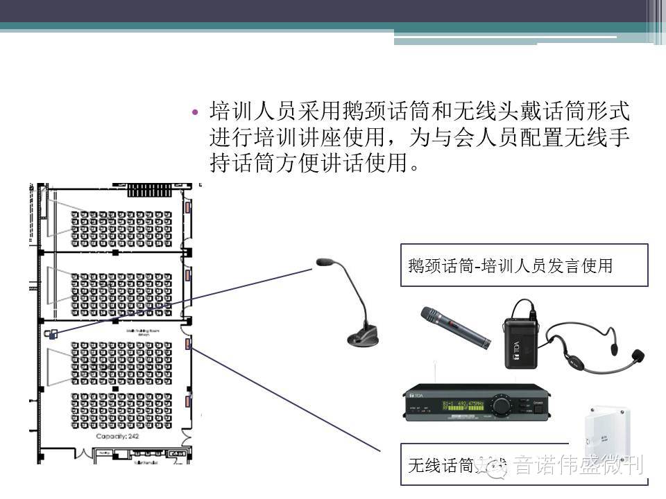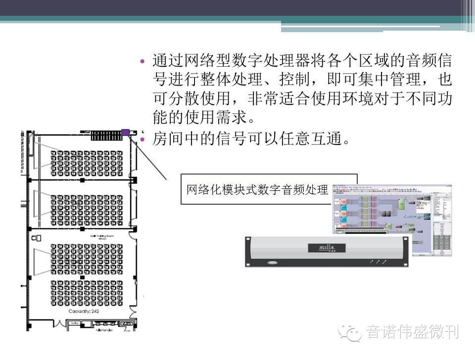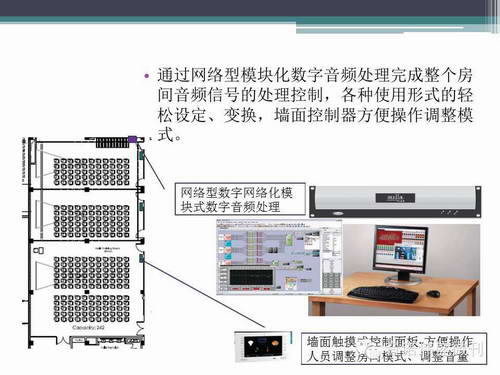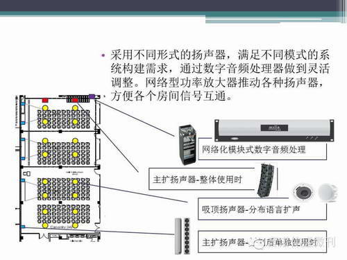 1.音频系统均以数字化音频处理器为核心,系统构建方式:音源(PC音频、讨论性会议话筒、无线话筒)+数字音频处理器(矩阵、分频、分配、反馈抑制、均衡调节、自动混音等)+功率放大器(多通道)+壁挂扬声器+吸顶扬声器,具有操作简单、易懂等特点,改变了传统音响系统操作繁琐、系统设备繁多等状况。配合集中控制系统控制数字音频处理器来调整系统模式、音量等功能。