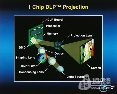 DLP技术的核心是由数以万计被微型链链接固定的镜片所组成的数字显微镜系统,这些镜片沿光源前后倾斜,反射出或亮或暗的灰色阴影,经过色轮过滤后投射出彩色图像。