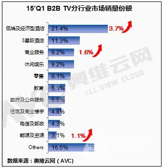 2014年Q1商用电视市场,TOP10行业销量份额达83.5%,其中近年来各大连锁酒店品牌下的商务酒店、中档酒店快速扩张,带动了对商用电视的需求,其中Q1低端及经济型酒店行业份额同比增长3.7个百分点,增长明显;此外,商业服务行业里涵盖的智慧医疗、智慧养老、智慧餐饮等智慧化产业的发展也拉动了商用电视的部分需求。