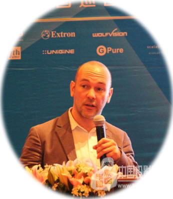 VYV 总经理Eric Plante先生对VYV 秀场投影播放校准技术进行介绍,可以实现与演员的互动,实时位置定位校准。同时他介绍了VYV最新的全球案例,在中国与科视、赢康进行了紧密合作,参与了汉秀和傣秀。