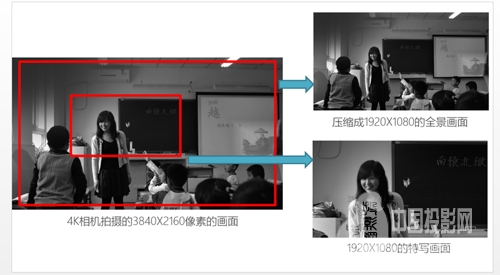 这同时也是鸿合最新推出的分布式常态化录播方案中的一大亮点。该方案前端采用一台使用纯嵌入式架构的录播主机,连接两台摄像机,其中一台摄像机拍摄学生全景,另一台摄像机采用高端ISP方案,拍摄3840*2160分辨率的超高清画面,从中压缩出一路标准的1080P高清教师全景画面,并利用摄像机中的“SmartTracker”自动跟踪算法,在全景画面中快速搜索教师,进行教师精准跟踪。跟踪结果以1080P的高清视频输出,形成一个接近于带跟踪的精品录播三机位的常态化录播方案。