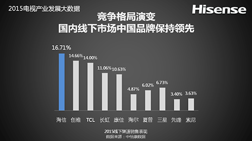 国内彩电线下市场表现看, 中国品牌依然保持领先。根据中怡康统计数据,2015年,海信液晶电视的零售量和零售额占有率分别为:16.71%、16.51%,双双高居第一位,并超出第二名两个百分点以上,至此,海信平板电视已经连续12年高居行业第一位。