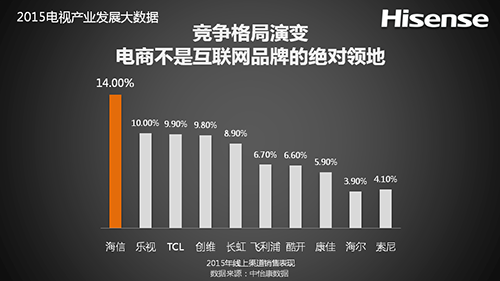 2015年,相继10多家互联网电视企业进入中国彩电市场。海信认为,互联网品牌对市场的冲击是有的,但率先完成智能化转型并拥有深厚技术底蕴的传统企业依然可以保持自己的领先优势,电商不是互联网品牌的绝对领地。截止2015年12月27日中怡康线上监测周报年累数据显示,海信线上市场零售量和零售额的占有率分别为14.0%和14.5%,双双高居第一位,超出第二名4个百分点。