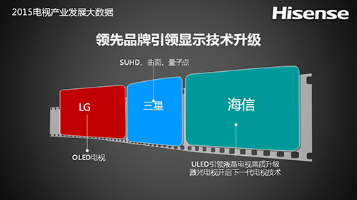 2015年,由全球领先品牌发起的显示技术升级成为行业发展关键词。不论是三星的SUHD、LG的OLED,还是海信的ULED和激光影院电视,都代表了当今全球彩电市场的最高水平,它们都是通过在显示技术上的创新,推动了产业升级,做大了高端市场。