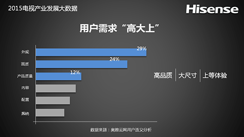2015年消费者需求呈现出“高大上”的特点:高品质、大尺寸和上等体验。外观、画质、产品质量、内容、配置、智能系统是消费者购买时考虑的关键要素。外观、画质最受用户关注,提升外观工艺、提升画质水平是彩电企业后续非常重要的创新方向。