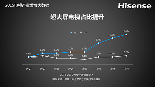 2015年,消费市场对超大屏电视的需求快速增长,65寸、70寸等超大屏幕市场的增势更为显著,在过去的一年里,70寸的市场份额增长了一倍以上。其中激光影院电视将进一步激发用户对超大屏电视的需求。