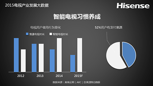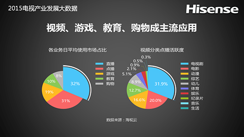 中国电视用户的使用行为已经发生变化,2015年,用户使用智能电视的平均时长为3.5小时,而且有52%用户有使用智能电视的支付意愿,用户已经逐步接受视频、游戏、教育、购物等付费内容。由此可见,中国用户不是不看电视了,而是开始习惯使用在线电视。海信海视云针对1582万智能电视激活用户的研究数据显示,视频点播、游戏、教育、购物成为最受欢迎的应用,未来客厅经济的雏形已初步呈现。