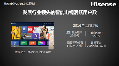2016年,海信智能电视的运营目标是,累积用户数达到2700万,日活跃用户达到950万,视频平均观看时长240分钟,日广告曝光量15000CPM。