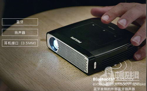 在接口方面,飞利浦PP4935带有USB接口、HDMI接口、Mini HDMI高清输入接口、耳机接口和电源接口,同时侧面一个Micro SD卡插槽,没有传统商务投影机的VGA、DVI接口,不过设备内置了蓝牙,可以无线连接蓝牙音响做外放。